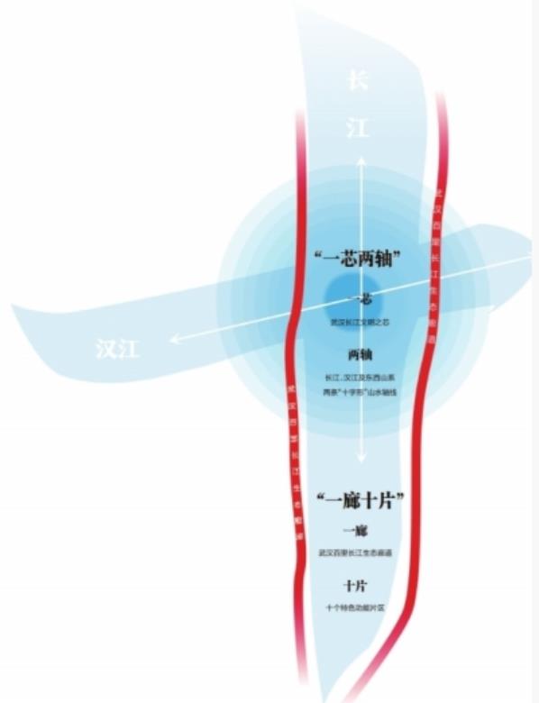 “一芯兩軸”打造“武漢長(zhǎng)江文明之芯”,錨固長(zhǎng)江、漢江及東西山系為依托的兩條“十字形”山水軸線。