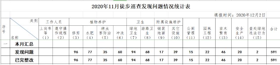 11月份局屬各綠化管養(yǎng)單位徒步巡查共發(fā)現(xiàn)問題591條,發(fā)現(xiàn)問題基本整改完成。通過匯總發(fā)現(xiàn)存在問題zui多的方面是植物修剪、綠地衛(wèi)生、游路衛(wèi)生,分別是96條、94條、68條。各單位要加強(qiáng)冬季植物修剪整形,確保植物修剪層次分明。加強(qiáng)綠地衛(wèi)生保潔力度,及時(shí)清掃枯枝落葉,白色垃圾,確保各公園廣場、綠地環(huán)境干凈整潔。