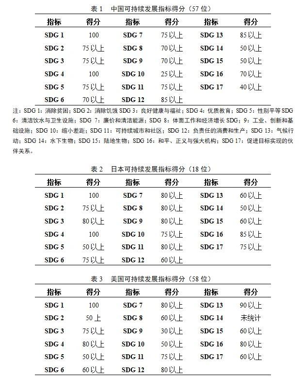 該報(bào)告計(jì)算了165個國家的可持續(xù)發(fā)展指標(biāo)得分。其中中國排名第57位。其中17個子目標(biāo)得分見表1。作為比較,日本和美國的得分分別見表2和表3。