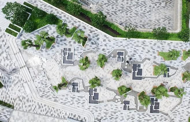 ??用線條勾勒出美,利用線條的隨意性,創(chuàng)造不同的視覺空間感,令人們對公共空間的規(guī)劃尺度形成感知。直線形的線條鋪裝引導(dǎo)游人前進;在需要游人駐足停留的場所,則采用無方向性或穩(wěn)定性的鋪裝;通過鋪裝線條的變化,可以強化空間感。
