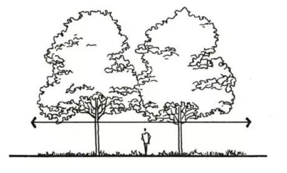 覆蓋空間一般是指冠大蔭濃的大喬木或攀援植物覆蓋的花架、拱門等,構(gòu)成頂部覆蓋、四周開敞的下部活動空間。這類空間比較涼爽,視線通透,下部只有樹干,活動空間較大,遮蔭效果好。多用于林蔭道、花架等綠化。
